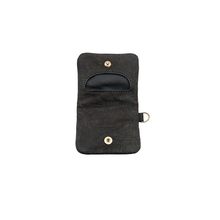掌に収まるタイプのコンパクトなコインケース。本体は袋縫い独特の膨らみと丸みのあるシルエットをしています。サイドにあるDカンに2052等のネックストラップをジョイントすることも可能です。